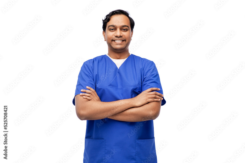 healthcare, profession and medicine concept - happy smiling indian doctor or male nurse in blue uniform with crossed arms over white background