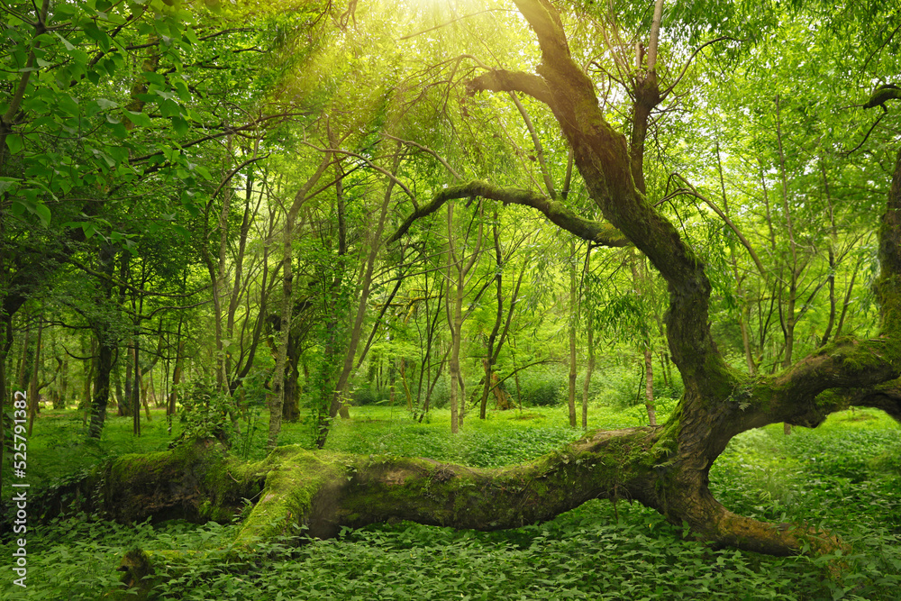 Picturesque view of tranquil park with green plants and fallen tree