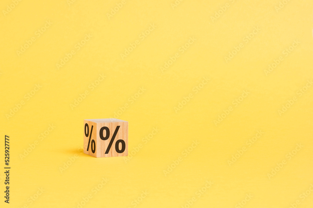 percent sign on wooden cube with copy space. concept of sale and discount, yellow background