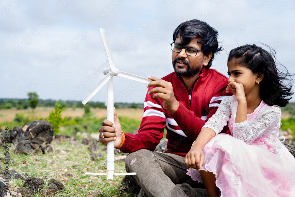 Father playing and explaining to daughter by holding toy wind power fan on top of mountain - concept of development, bonding and renewable energy