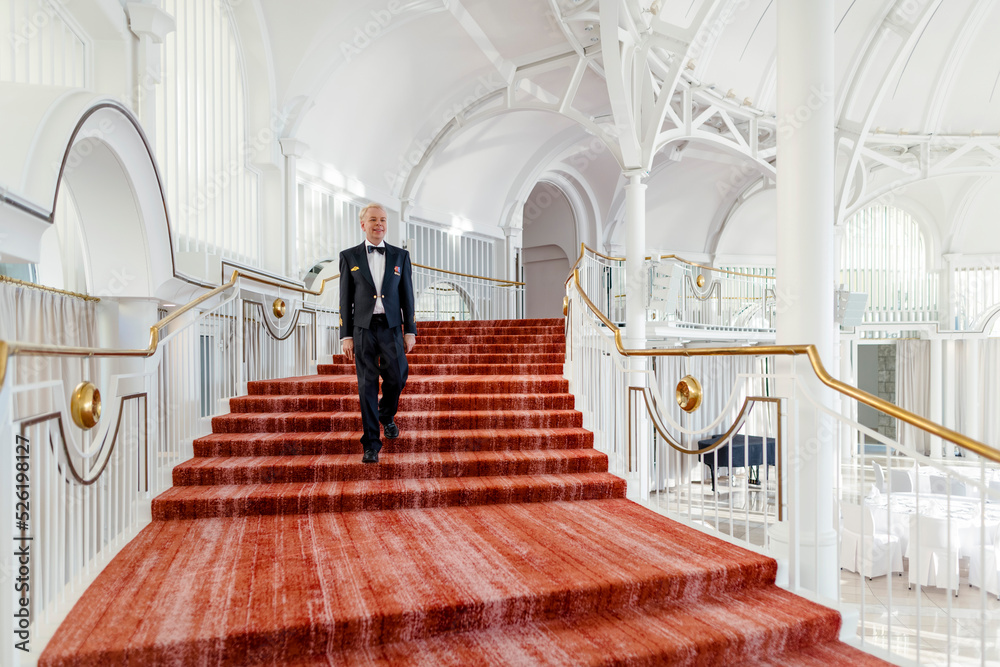 Ein Oberstabsbootsmann der deutschen Marine schreitet in seinem Gesellschaftsanzug die Stufen mit rotem Teppich herab.
