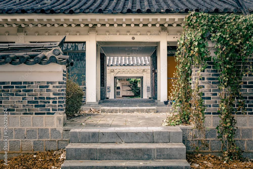 Stone brick door entrance to Bomun Lake Korean traditional village in Gyeongju South Korea