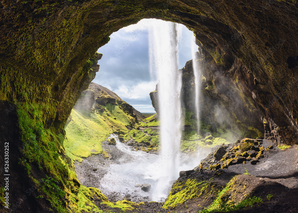 Kernufoss waterfall flowing from cliff and hiker standing in summer at Iceland