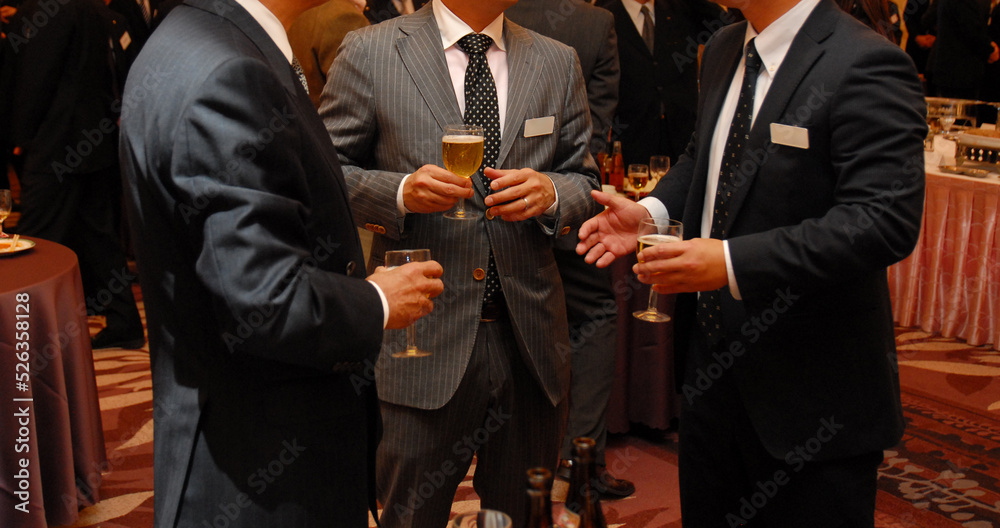 立食パーティーで談笑する3人のスーツ姿のビジネスマン