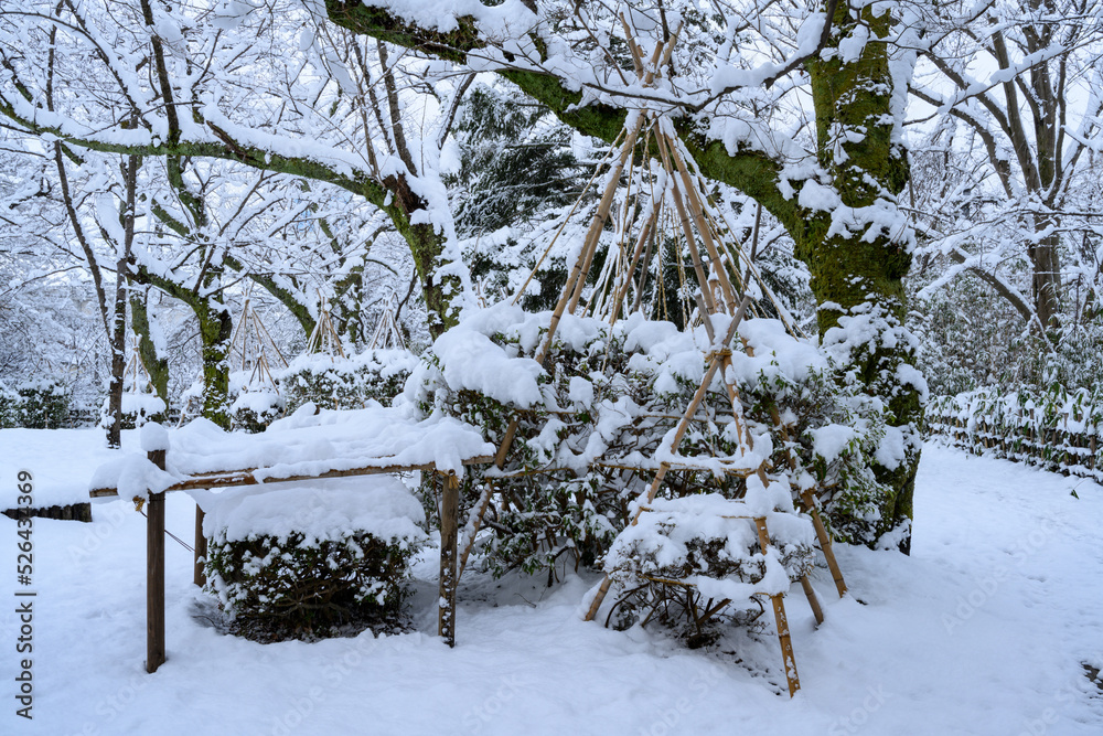 湿った重い雪の積もる庭園