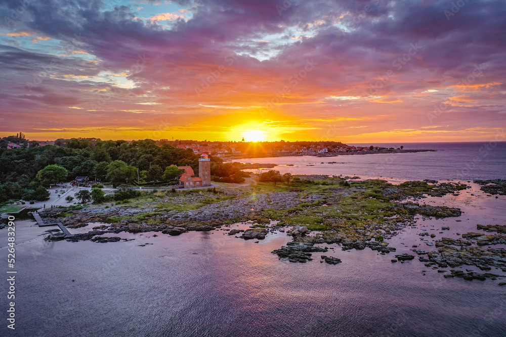 aerial view of svaneke lighthouse at sea coast during sunset on bornholm denmark