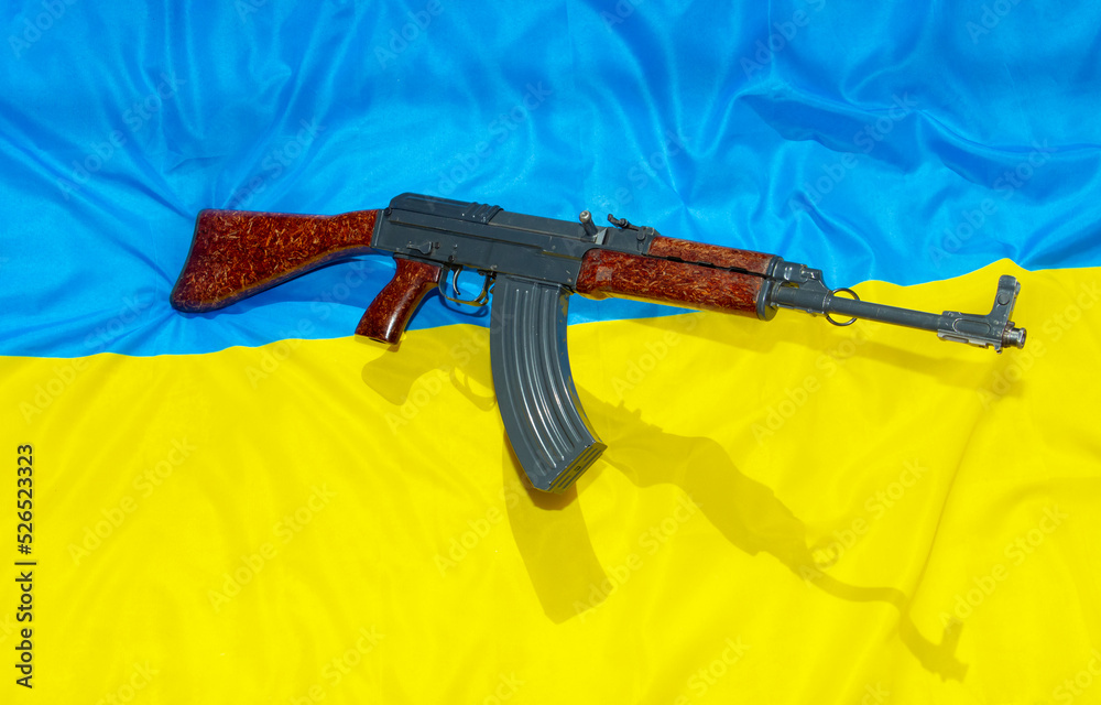 The old assault rifle above the Ukrainian flag symbolizes resistance against the aggressor