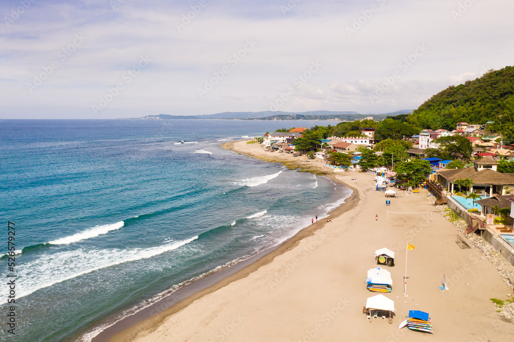 Sandy coast, buildings and blue sea with waves. San Juan, La Union, Philippines. The beaches of the Philippine Islands. Town near the sea.