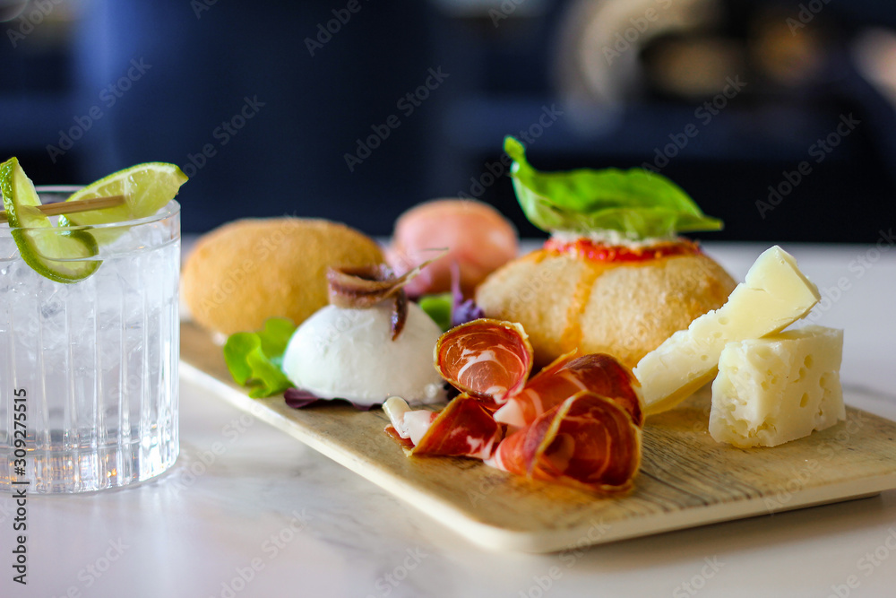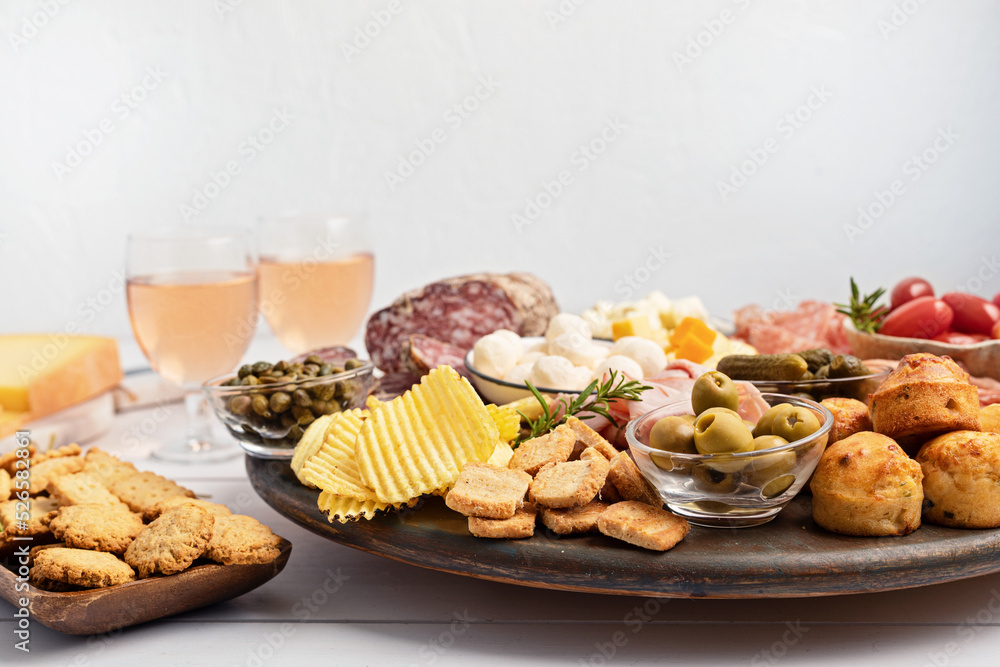 Appetizers table with different antipasti, charcuterie, snacks, cheese. Finger food for buffet party. Traditional french or italian entires. Top view
