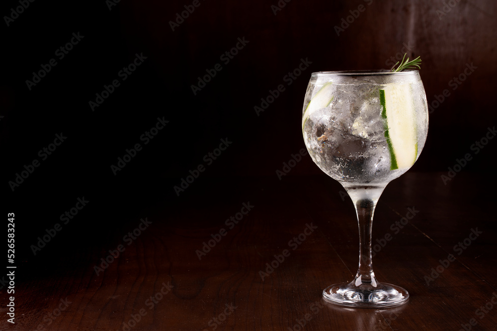 mixology two glasses of gin tonic cocktail, with rosemary and cucumber and lots of ice under wooden table in front corner