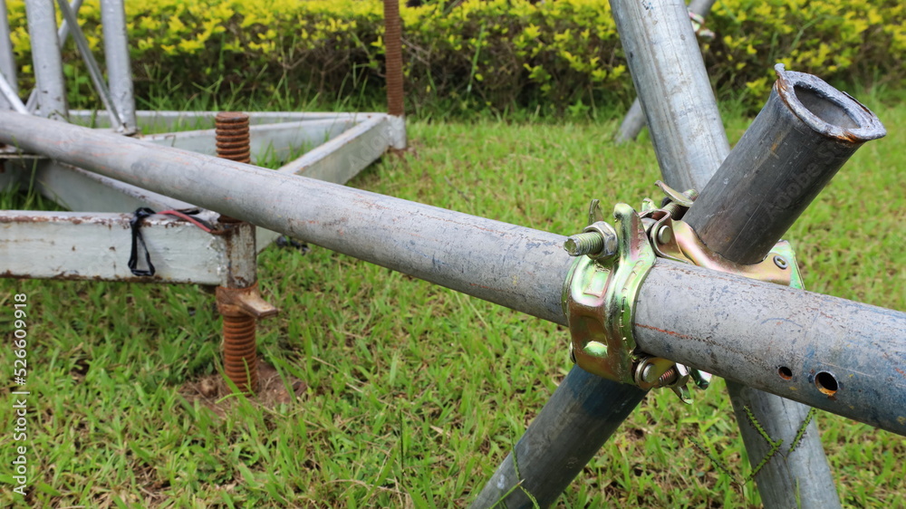 Metal scaffolding pipe clamp. Steel scaffolding and mounting parts for strength in construction sites or concert stage supports. Close-up and select focus