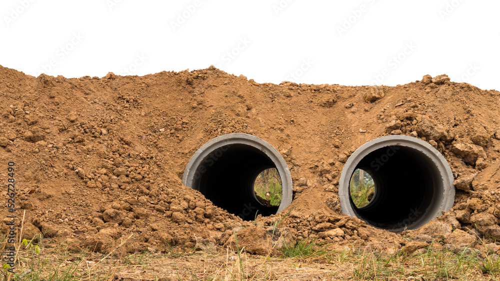Close-up image of a sandy loam, with both large concrete pipes inside for water delivery.