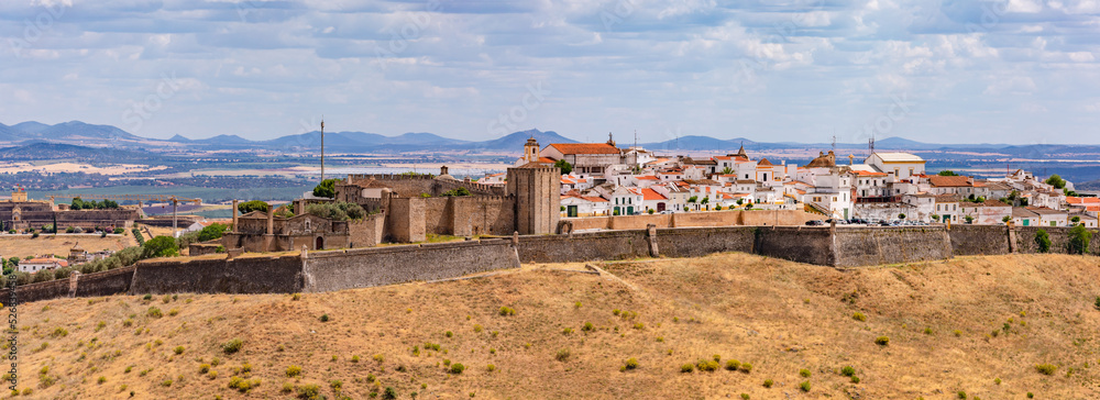 Panorama of the castle fortress and ramparts of the historic town of Elvas, Alentejo, southeastern Portugal
