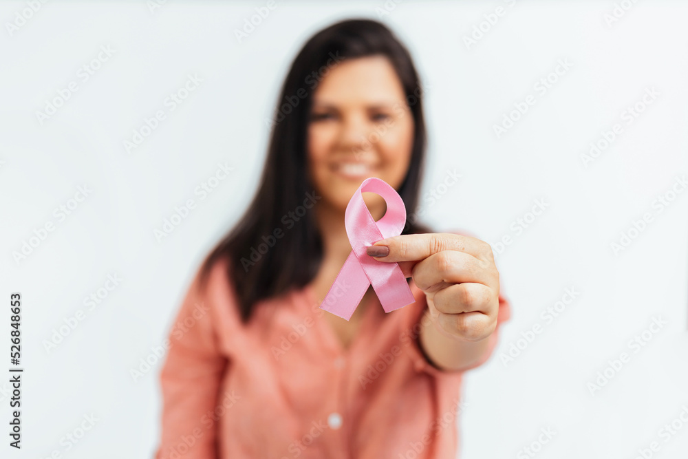 Woman holding pink ribbon, breast cancer awareness, pink october concept. Selective focus on pink ribbon