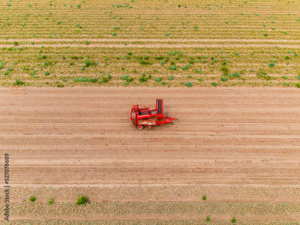 A red trailer for onion harvest stands lonely on a field with onions, Germany