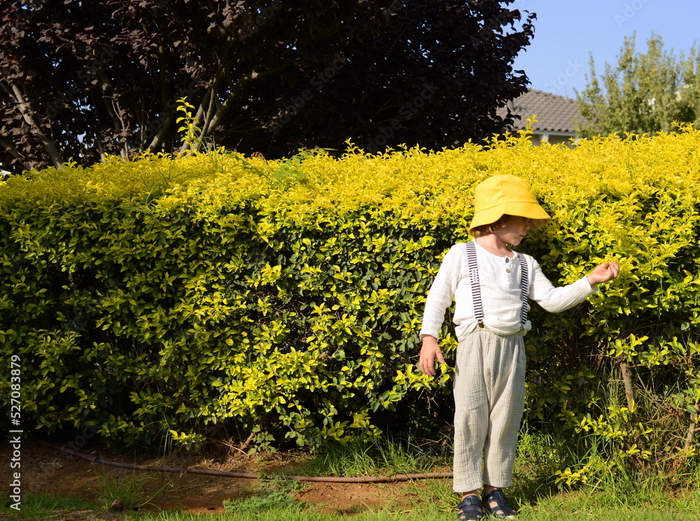 Positive child on vacation. The boy is walking in the park. Boy with suspenders and long hair. Concept: cute baby, kindergarten, children's menu, seed campaigns