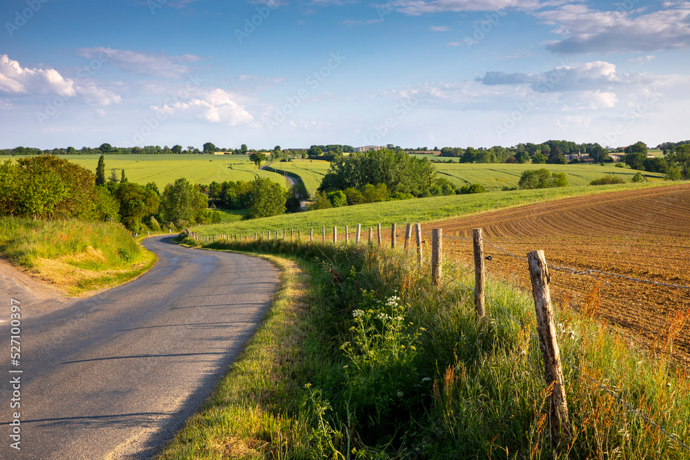 Paysage de France en campagne au milieu des champs au printemps.