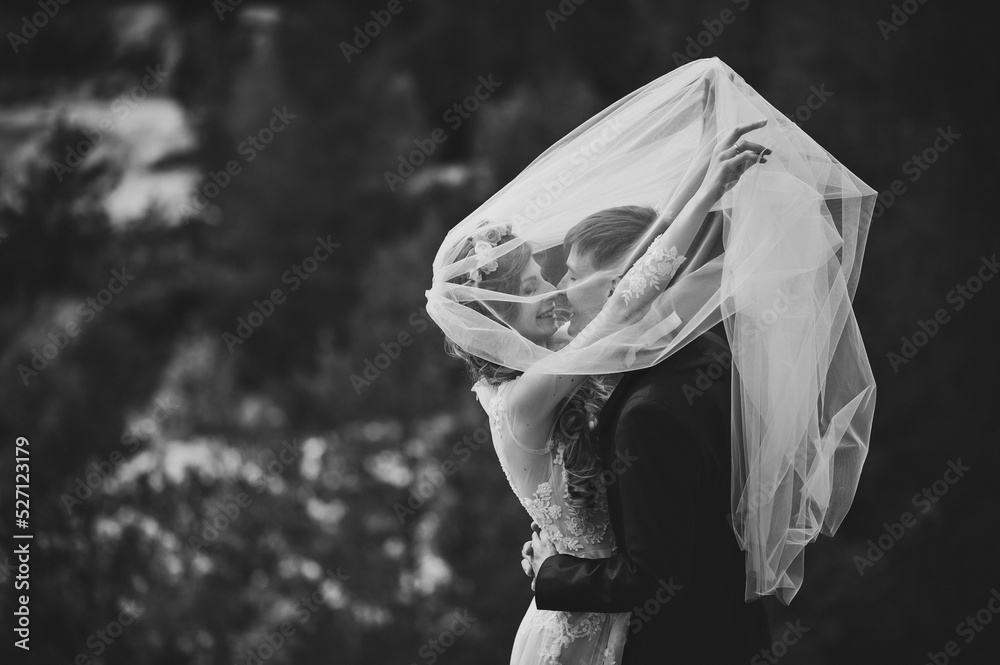Romantic wedding moment, bride and groom smiles to each other under the veil, happy and joyful moment on nature in the park. Black and white photo.