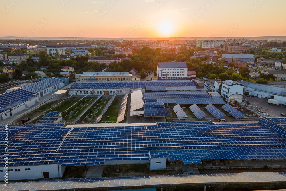 Aerial view of solar power plant with blue photovoltaic panels mounted on industrial building roof for producing green ecological electricity. Production of sustainable energy concept