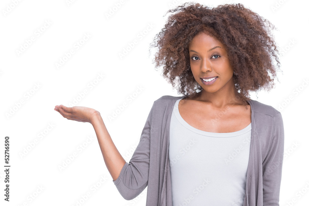 Attractive brunette holding hand out as a presentation