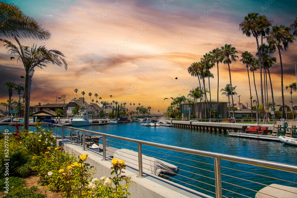 a gorgeous summer landscape at Naples Canals with blue ocean water surrounded by colorful flowers, lush green palm trees and plants and boats docked along the banks with powerful clouds at sunset