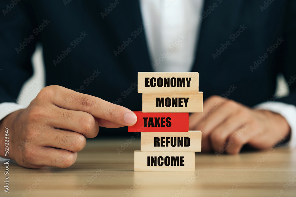 Businessman's hand takes out a red block with the inscription - TAXES From a set of wooden blocks with financial inscriptions Government taxes, Tax and Vat concept.tax return.tax time.