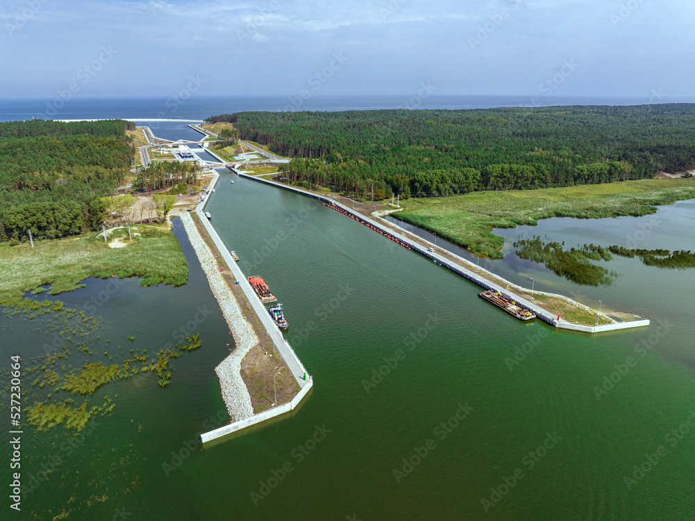 Construction of a canal to the Baltic Sea on the Vistula Spit. The Bay of Gdańsk to the Vistula Lagoon. Construction site from above. Poland. Europe.