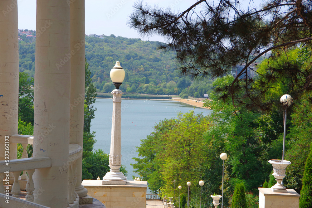 Moldova. Kishinev. 08.28.2022. Arbor with white columns and a view of the lake. Park Valea Morilor.
