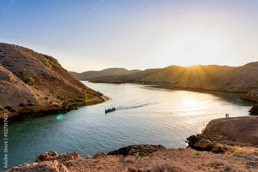 Sunrise in a Fjord like in Bandar Khairan with a boat sailing, Sultanate of Oman