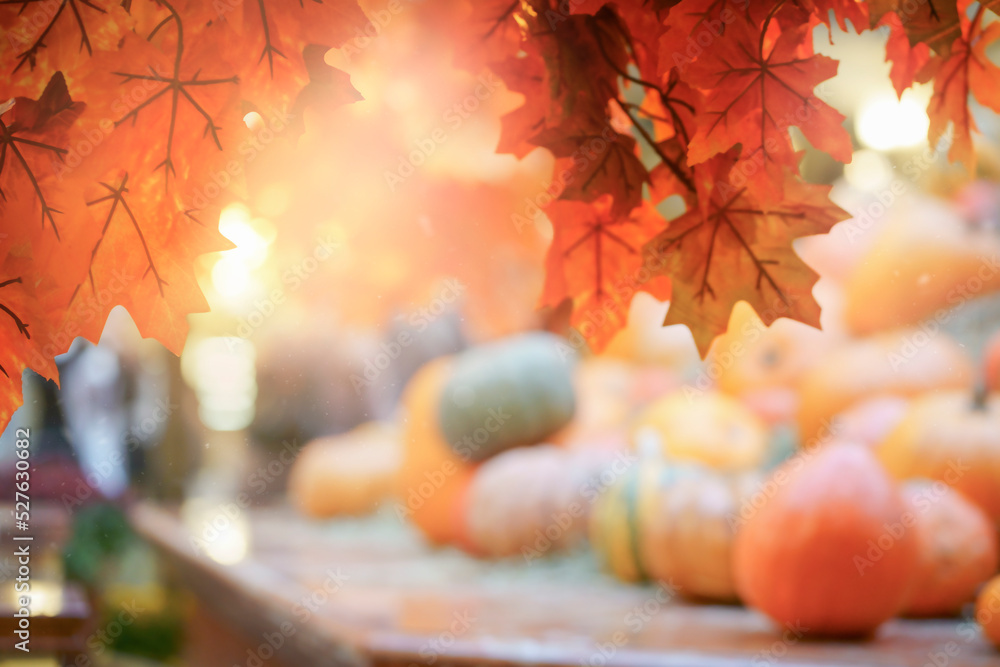 Blurred Autumn coloful background with pumpkins and Marple leaves