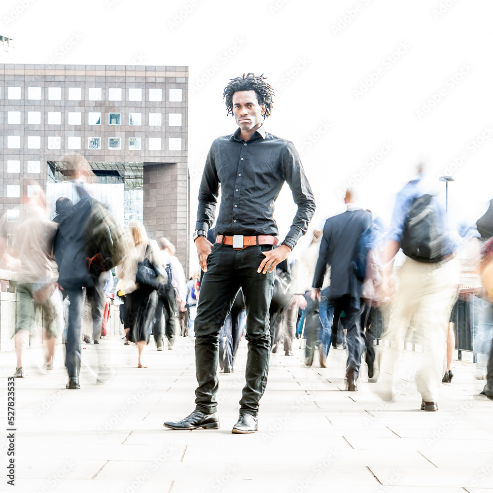Against the Flow. An individual standing confidently against the flow of his conventional environment.