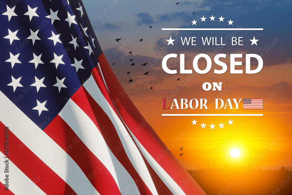 Labor Day Background Design. American flag on a background of sunset sky with flying birds with a message. We will be Closed on Labor Day. 3d rendering.