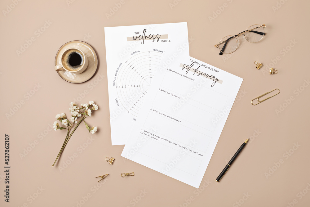 Desktop with life coaching templates and office accessories. Organization, self-development, online coaching concept. Top view, falt lay