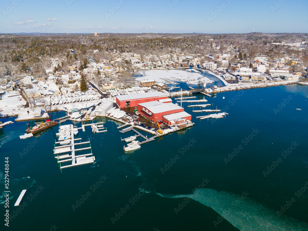 Manchester Marine and harbor aerial view in winter, Manchester by the sea, Cape Ann, Massachusetts MA, USA.
