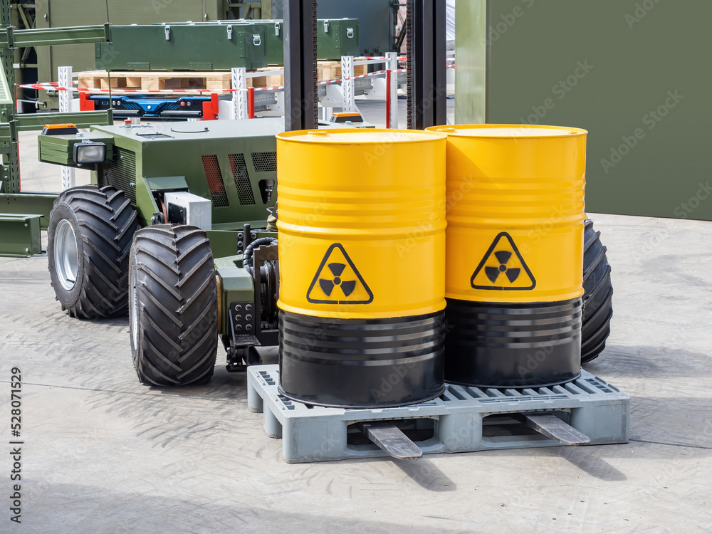 Radioactive hazard. Yellow barrels on forklift. Containers with dangerous liquid. Transportation and loading of radioactive substances. Barrels with radioactive symbol. Unmanned forklift with barrels