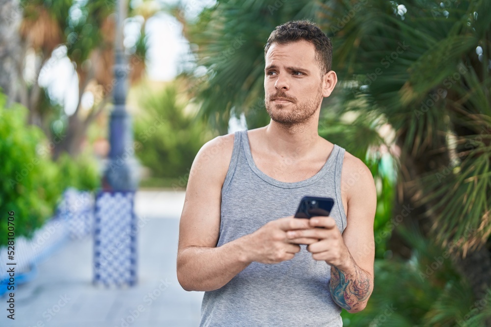 Young hispanic man using smartphone with serious expression at park