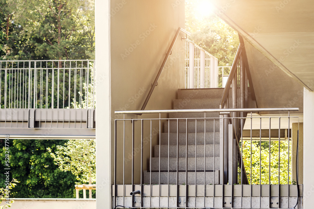 Stairs Outdoor Exterior residential Building. Staircase with metal Railing, Stainless steel Handrails. Backlight. Fire escape.