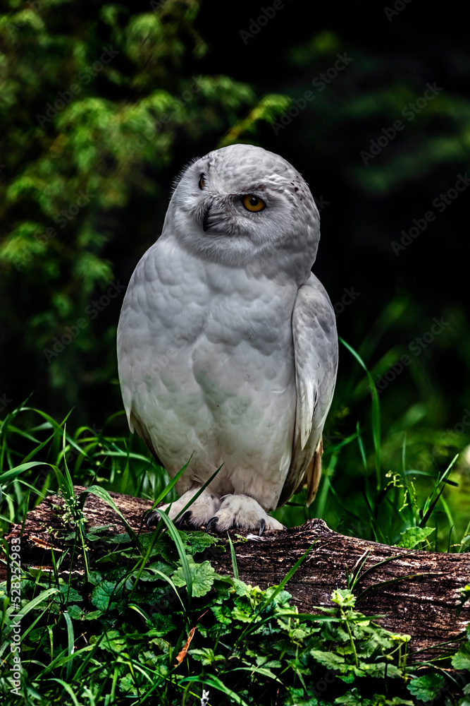 Snowy owl sitting on the beam. Latin name - Bubo scandiacus