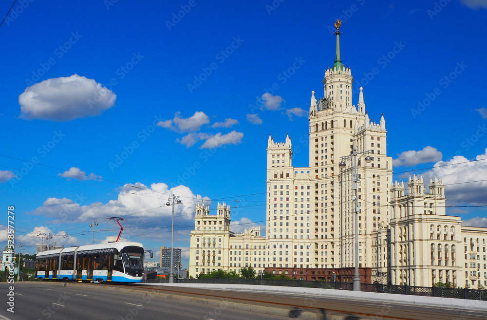 Russia, Moscow - July 2022: View of Kotelnicheskaya Embankment Building and tram from Bolshoy Ustinsky Bridge in Moscow