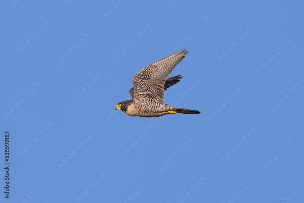 Close view of a Peregrine Falcon flying, seen in the wild in North California