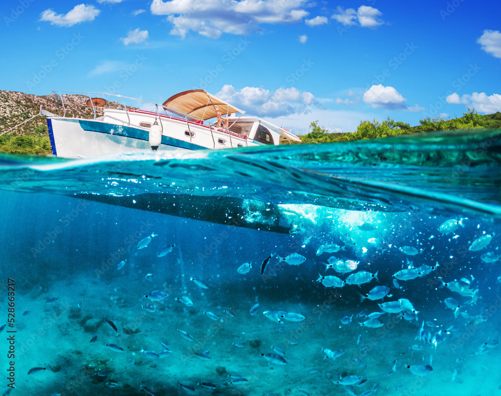 Split view - half underwater view of beautiful seabed with sea fishes and beautiful marine yacht, Turkey, Bodrum.
