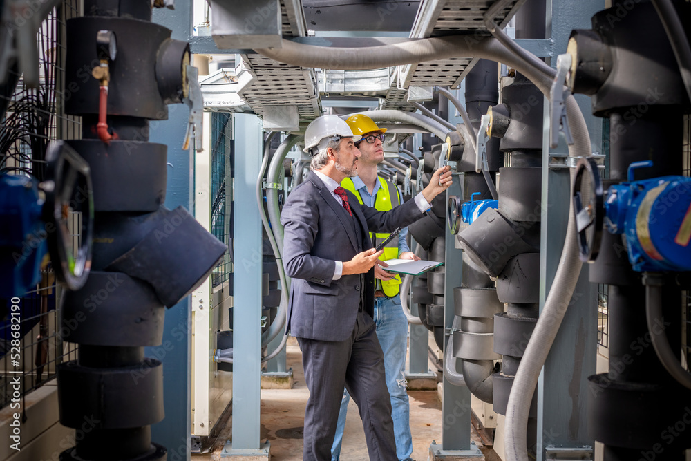 engineer under checking the industry cooling tower air conditioner is water cooling tower air chiller HVAC of large industrial building to control air system.