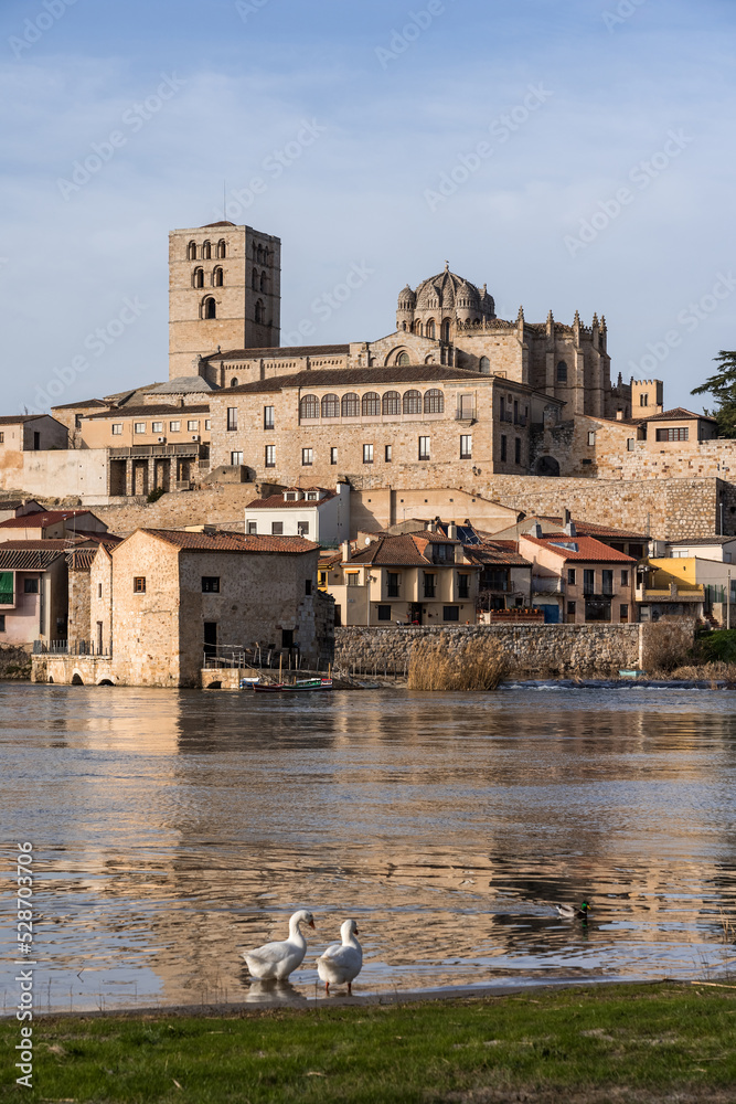 Zamora Romanesque cathedral and bell towers since Duero river. Spain