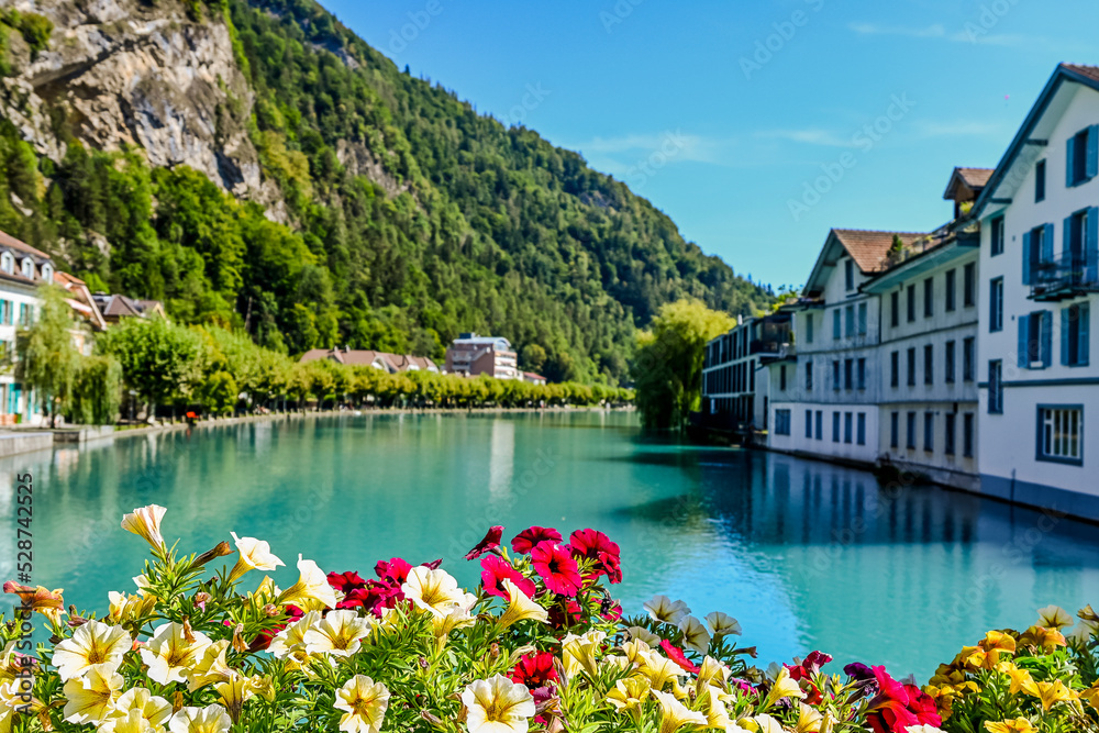 Unterseen, Aare, Fluss, Brücke, Uferweg, Altstadt, Altstadthäuser, Gassen, Interlaken, Obere Gasse, Alpen, Berner Oberland, Sommerblumen, Sommer, Schweiz