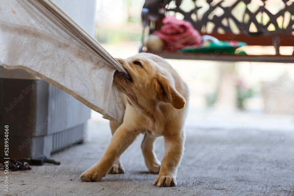 A little golden retrievers biting a towel after take a bath