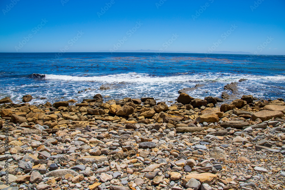 a gorgeous summer landscape at the beach with blue ocean water and sharp rocks long the shore with a stunning clear blue sky at Royal Beach park on White Point Beach in San Pedro California USA