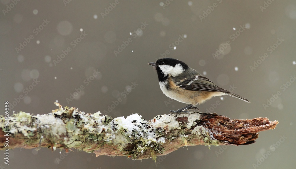 Coal Tit (Periparus ater) in falling snow.