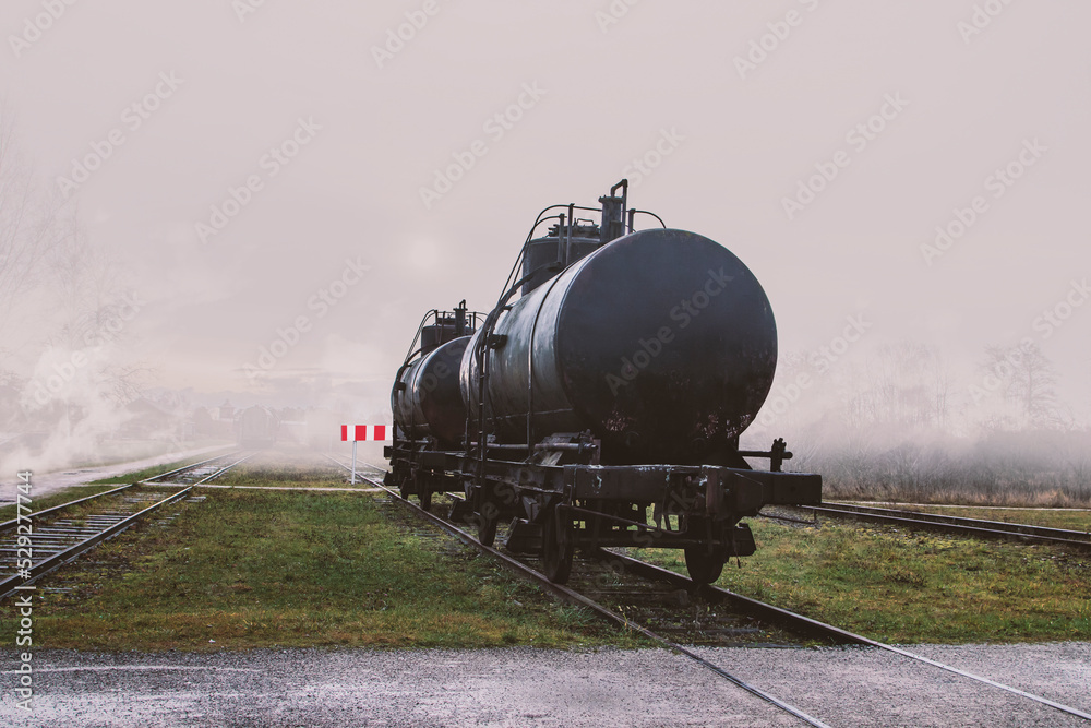 Oil embargo scene of two train tank cars standing behind a dead end traffic sign in front of fog and smoke with copy space