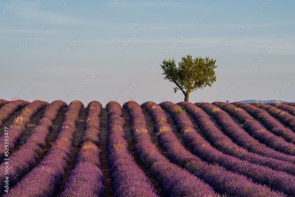 Lavendelfeld in der Morgensonne mit einem einzelnen Baum und den Bergen im Hintergrund in der Provence