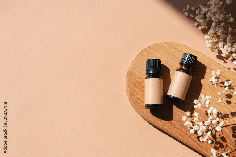 Amber bottles with craft label filled serum, tonic or essential oil on wooden tray and dry flowers. Beige background with daylight . Beauty concept for face and body care. Copy space